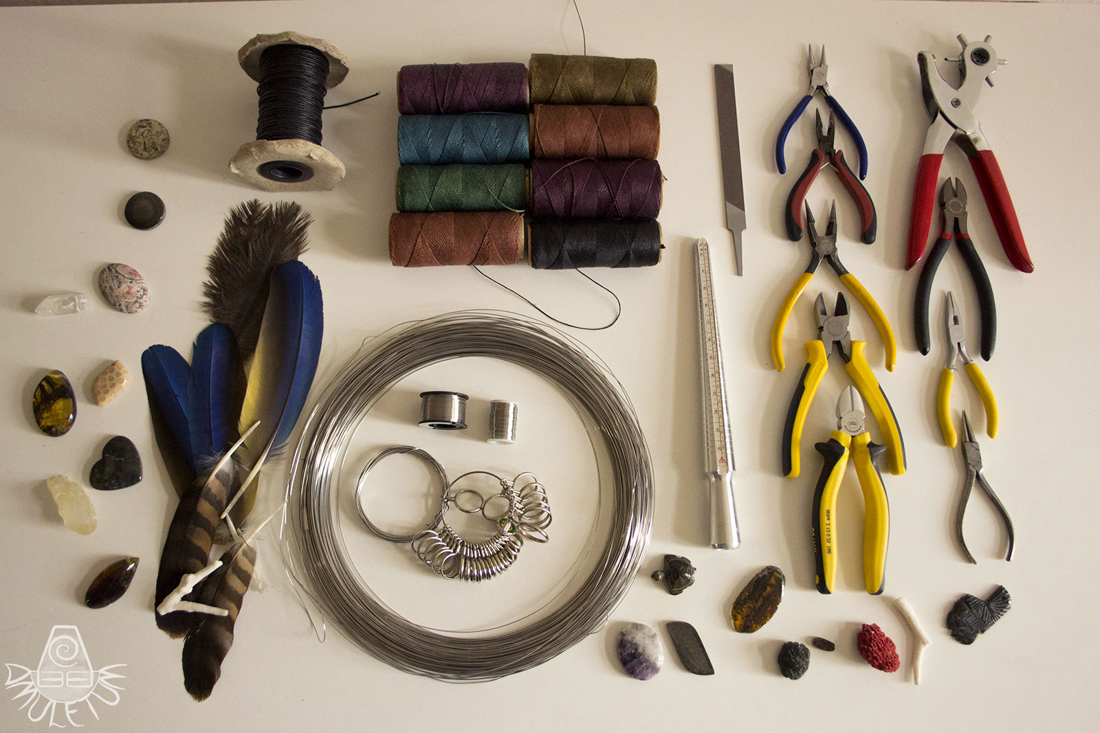 Ruční práce je na amuletech tedy už od počátku, řemeslníky z Mexických dílen a druhou stěžejní části amuletu je usazení kamene do šperku. Používáme více druhů technik a materiálů. Technika drátkování je jednou z nejpoužívanějších v naší tvorbě. Ohýbáme ručně drát přes kleštičky do různých forem a variací, podle nápadů, které vznikají během procesu tvorby. Každý šperk je originální od nápadu po zpracování.